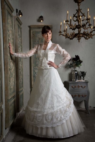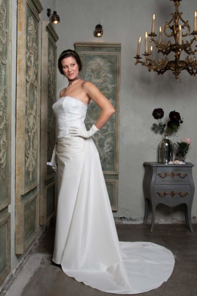 Habkönnyű ivoire, capuccino színben tündöklő, impozáns megjelenésű menyasszonyi ruha. Tiszta, 100% hernyóselyem két rétegű taft anyaga nemes fényt kölcsönöz viselőjének. Romantikus díszítőeleme a gyönyörű levélhímzésből eredő két rózsabimbó.